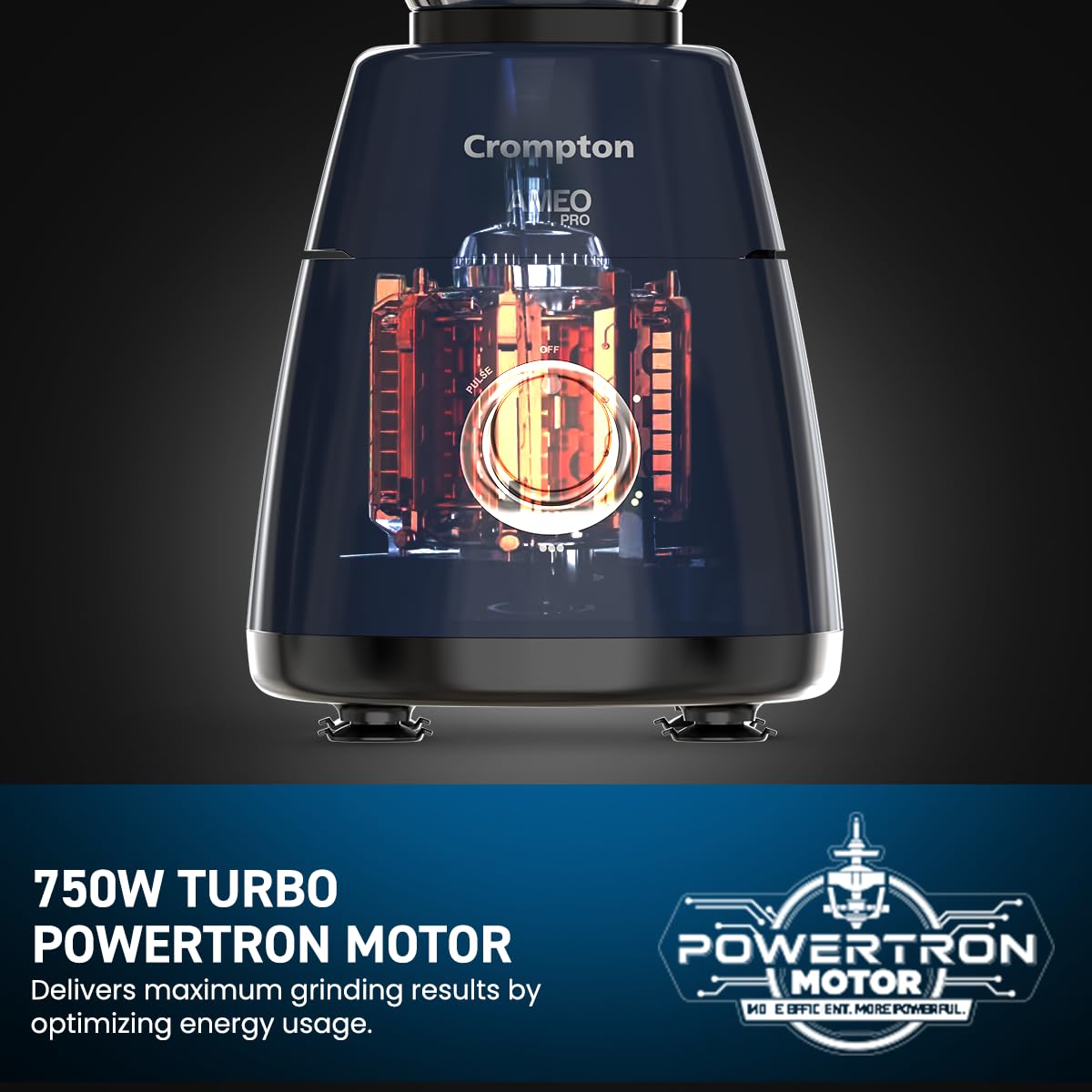 The Crompton Ameo Pro 750W Mixer Grinder is a powerful and reliable kitchen companion designed for effortless grinding and blending. Equipped with MaxiGrind Technology and Motor Vent-X Technology, it ensures superior performance, durability, and continuous operation without overheating. The set includes 3 stainless steel jars for dry and wet grinding, chutneys, and blending, along with 1 juicer jar for fresh juices. Its sleek black and blue design adds a modern touch to your kitchen while delivering efficiency and convenience.