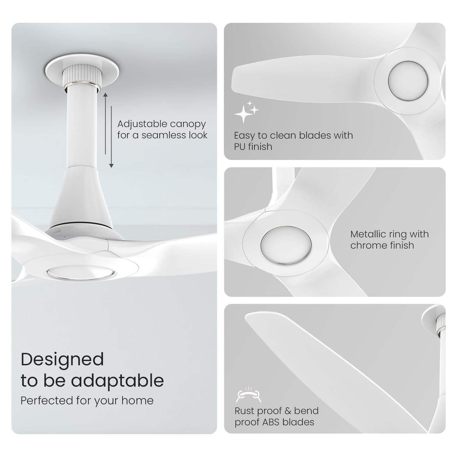 Aeroquiet Neu comes with a sweeping 1230 mm blade span, making it well-suited for medium to large rooms. Its highlight is the advanced 18-pole copper motor paired with aerodynamic ABS blades inspired by aircraft wing designs—this combination delivers high air thrust (rated at approximately 240 CCM) with minimal air-cutting noise. The white finish lends a clean, modern aesthetic that blends easily into most interiors, while the quiet operation makes it especially appropriate for bedrooms, home offices or any space where noise matters.